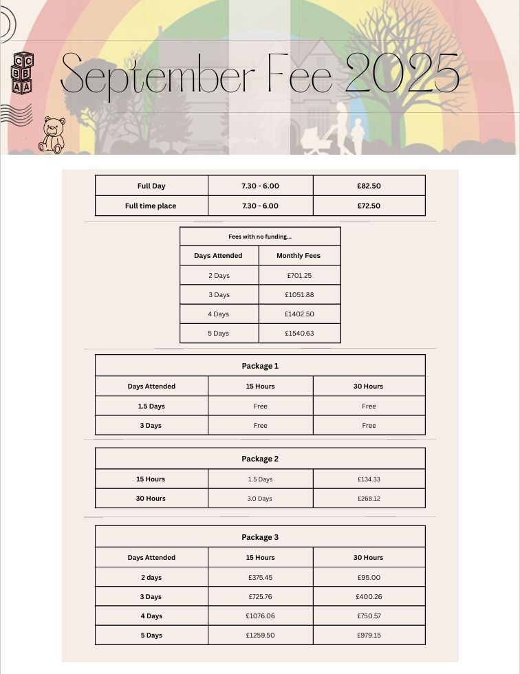We accept payments via bank transfer, Tax free childcare scheme and childcare vouchers.